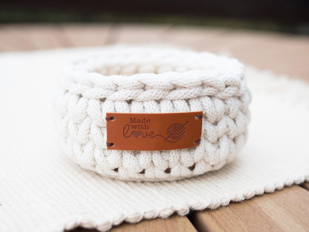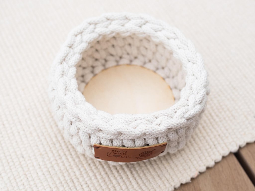 Základ tvoří pevné dřevěné dno z překližky, které dodává košíku stabilitu, a ručně háčkovaná struktura ze 100% bavlněné šňůry zajišťuje přírodní vzhled a příjemný pocit na dotek. Bavlněná šňůra je certifikovaná OEKO-TEX Standard 100.