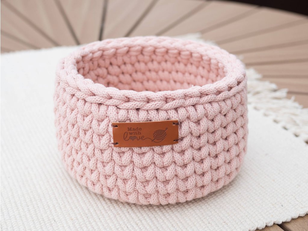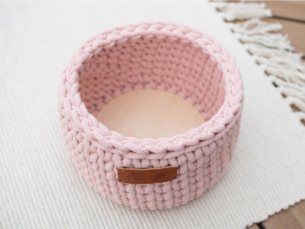 Dno košíku je vyrobeno z pevné dřevěné překližky, která zajišťuje stabilitu, zatímco 100% bavlněná šňůra, ze které je košík ručně uháčkovaný, dodává příjemný vzhled i strukturu. Bavlněná šňůra je certifikovaná OEKO-TEX Standard 100.