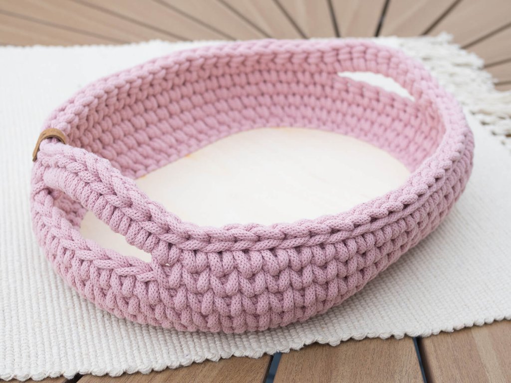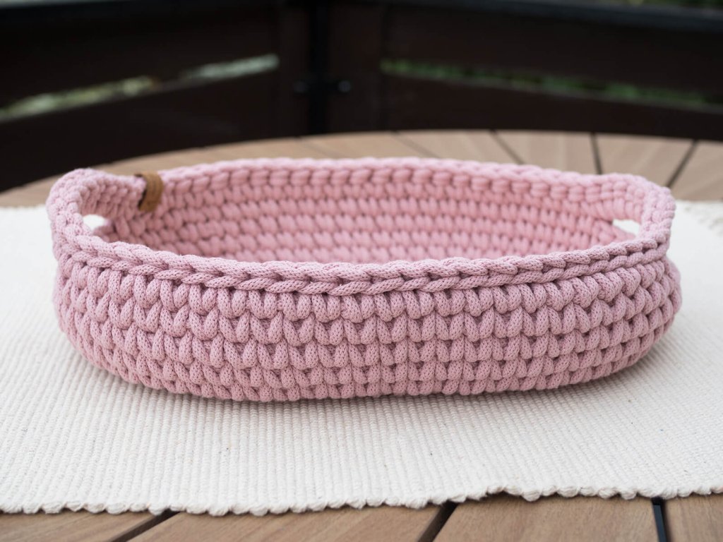 S tímto růžovým háčkovaným podnosem snadno dodáte svému prostoru jemnost a útulnost.